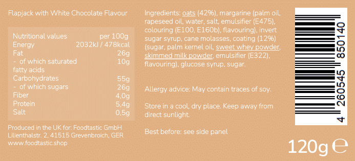 Haferflocken (42%), Margarine (Palmöl, Rapsöl, Wasser, Salz, Emulgator (E475), Farbstoffe (E100, E160b), Aroma), Invertzuckersirup, Rohrzuckermelasse, Überzug (12%) (Zucker, Palmkernöl, Süßmolkenpulver, Magermilchpulver, Emulgator (E322), Aroma), Glucosesirup,